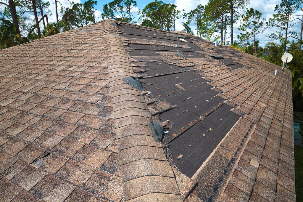 Torn-off shingles, broken seals, and lifted flashing — all lead to water intrusion if ignored.